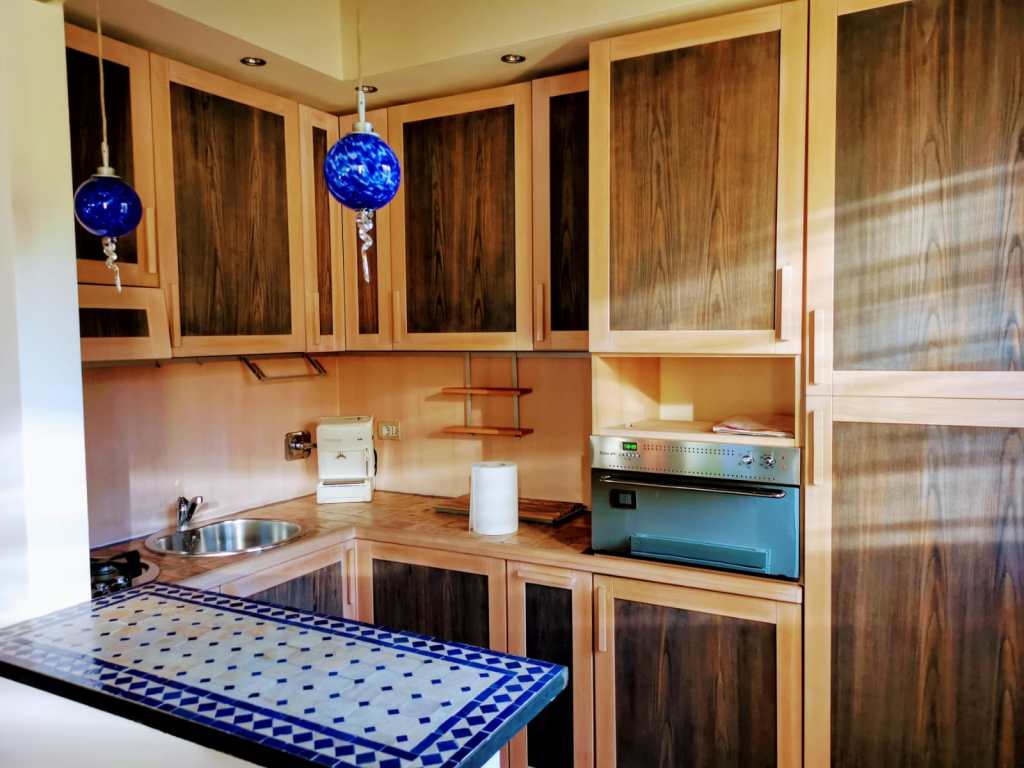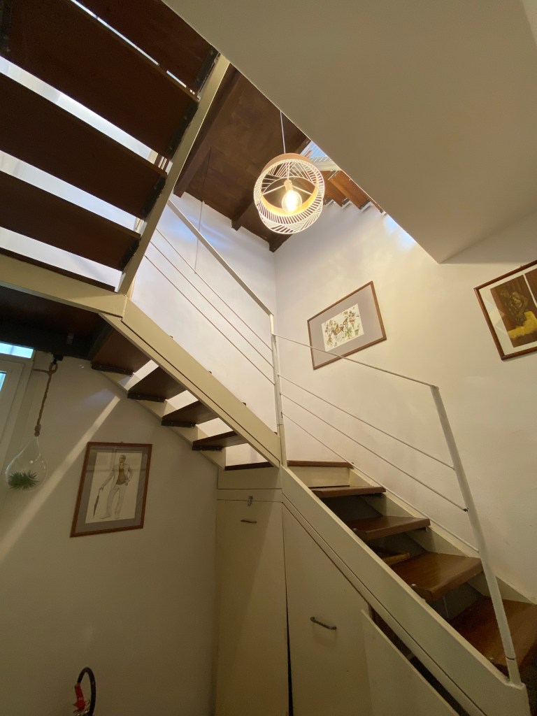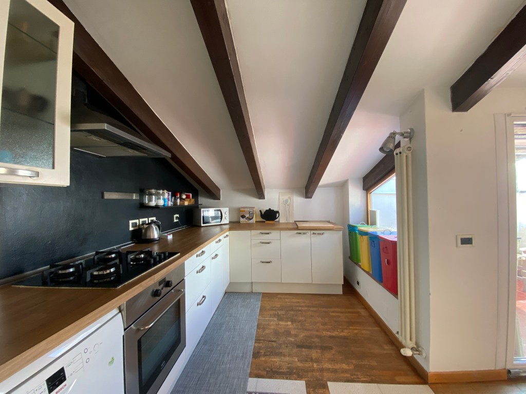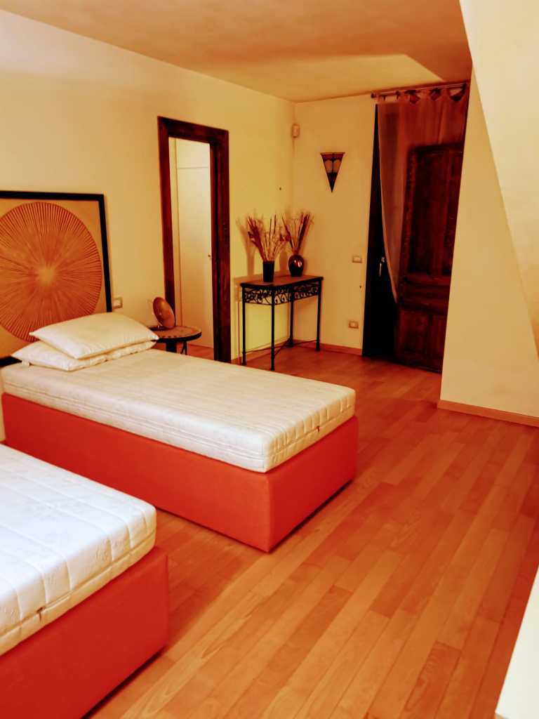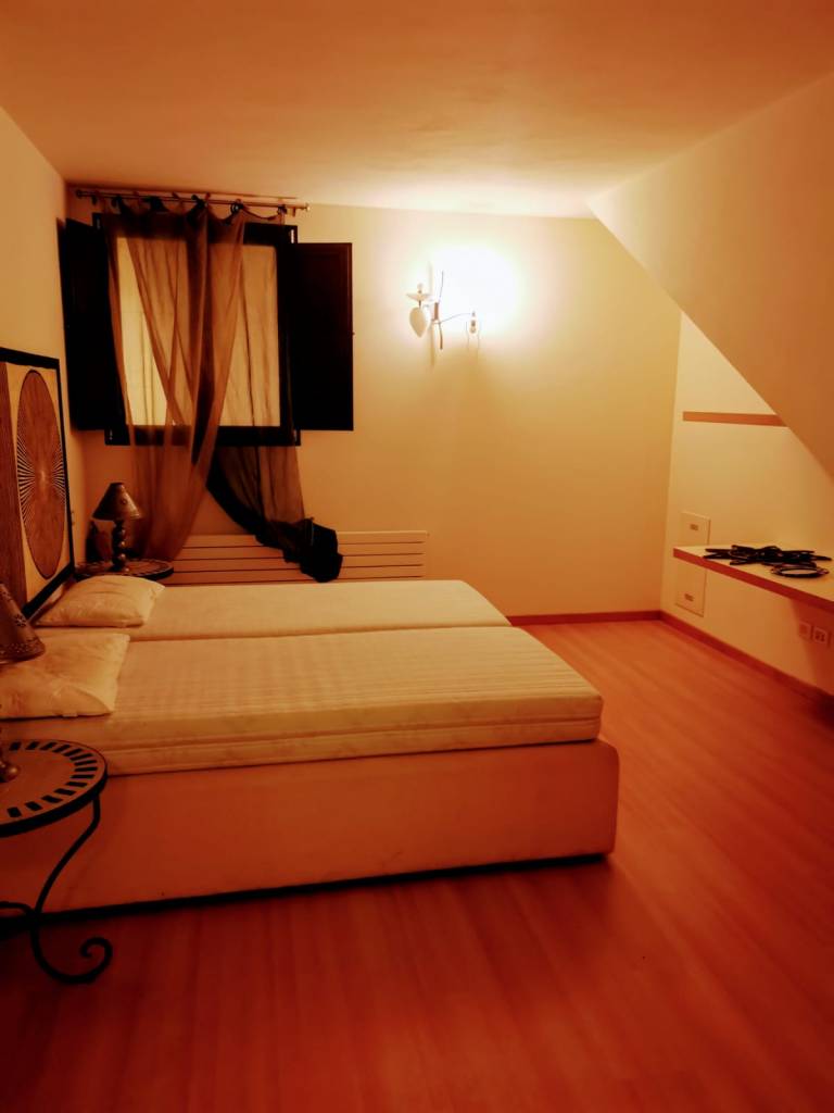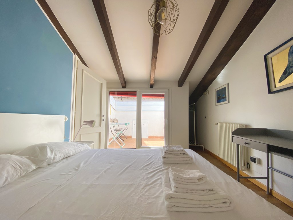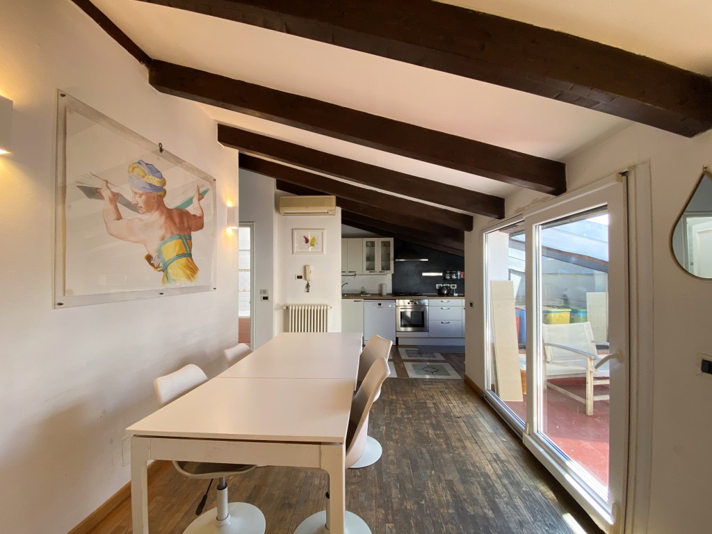 This apartment, located on the third floor of a building without a lift, opens onto a small entrance where a slightly steep staircase leads to the upper floor, to a very large and bright open space area, with access to a terrace equipped with a table and chairs for outdoor breakfasts. The whole apartment is located on the upper floor, so it is required to use the staircase to access the living room, the bedrooms and the baths. The living room is furnished with a large corner sofa that converts into a double bed, TV, dining area and a well-equipped open kitchen, also complete with dishwasher, oven and kettle.