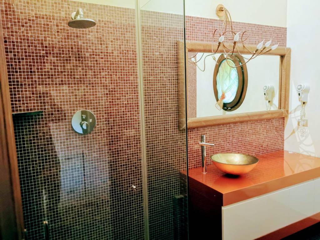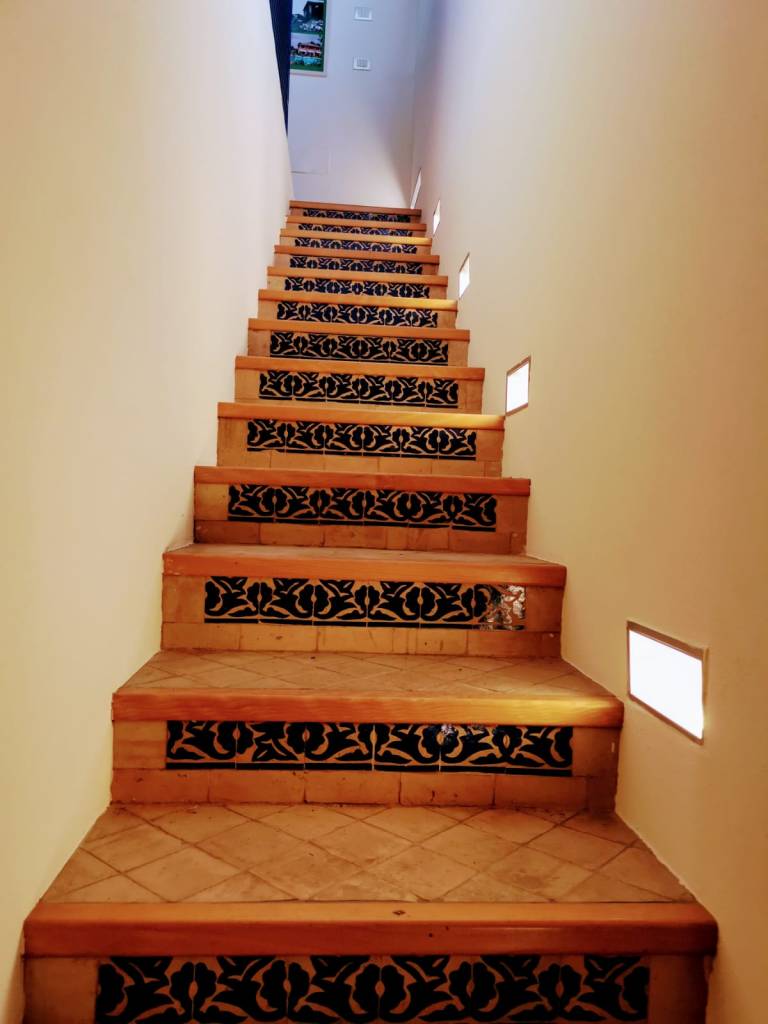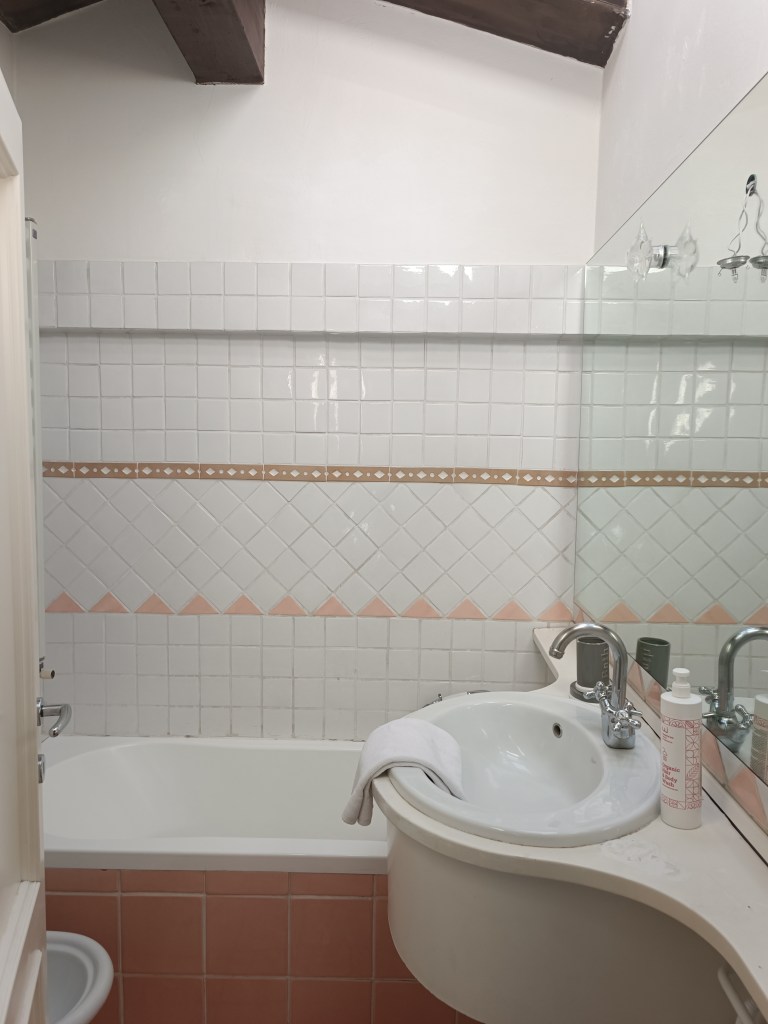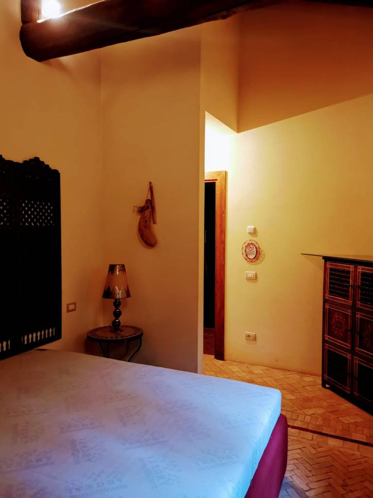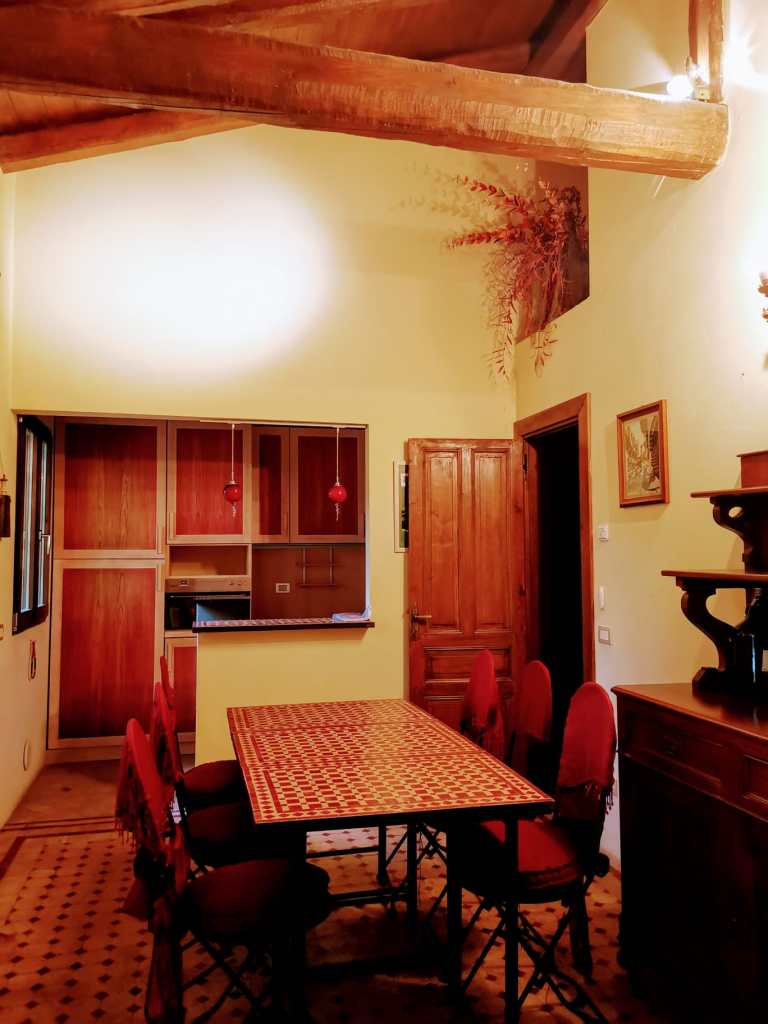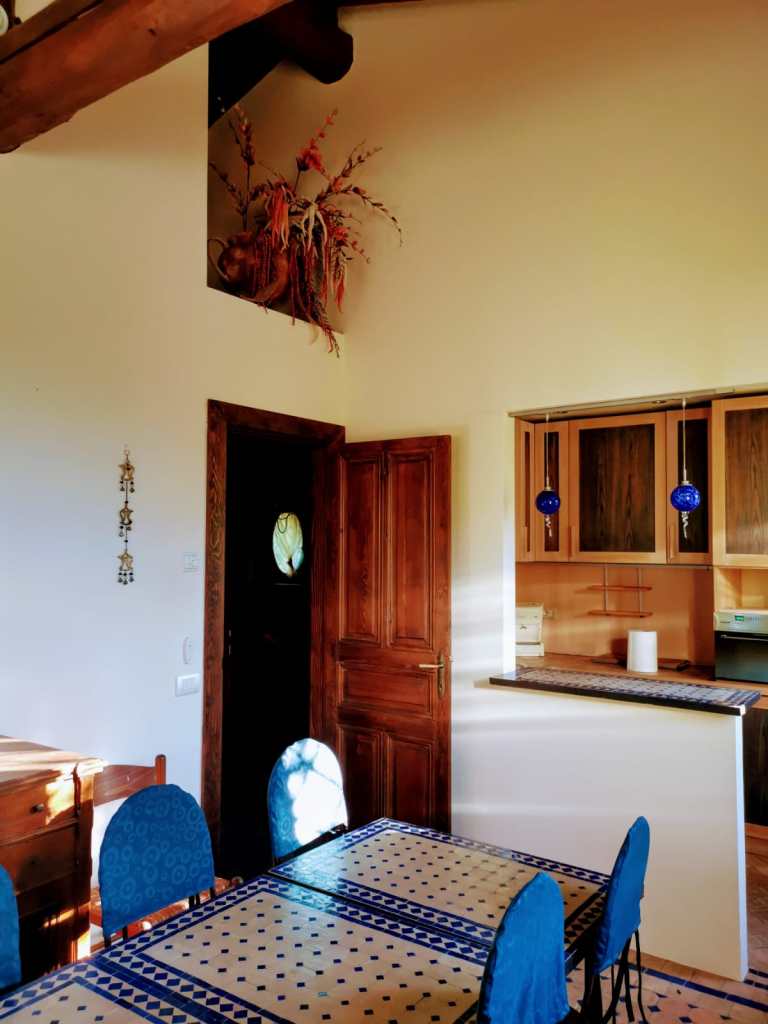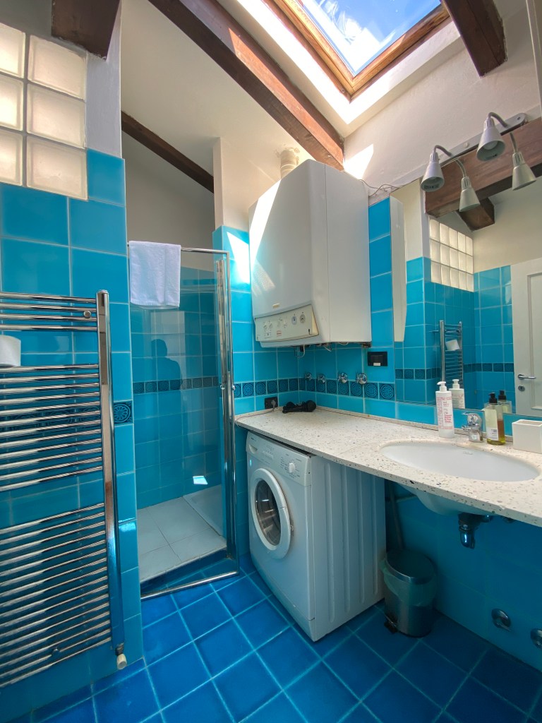 This apartment, located on the third floor of a building without a lift, opens onto a small entrance where a slightly steep staircase leads to the upper floor, to a very large and bright open space area, with access to a terrace equipped with a table and chairs for outdoor breakfasts. The whole apartment is located on the upper floor, so it is required to use the staircase to access the living room, the bedrooms and the baths. The living room is furnished with a large corner sofa that converts into a double bed, TV, dining area and a well-equipped open kitchen, also complete with dishwasher, oven and kettle.
